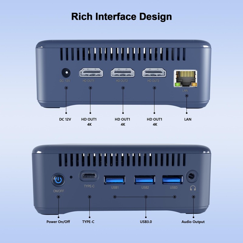 • 【Multiple Ports & Efficient Cooling】HSI 100 is equipped with 1 x DC 12 VC, 3 x HDMI 2.1, 1 x TYPE-C, 3 x USB 3.0, 1 x Audio Output, 1 x RJ45 Gigabit Ethernet port, which can be connected to servers and surveillance devices. Computers, monitors, projectors, TVs, etc. The built-in cooling fan ensures fast and efficient heat dissipation, so that the device can work stably. The size of the mini PC is 11.6 cm x 11.6 cm x 4.6 cm, weighs less than 1 kg, is lightweight and easy to carry and is very suitable for daily use in the office and travel.