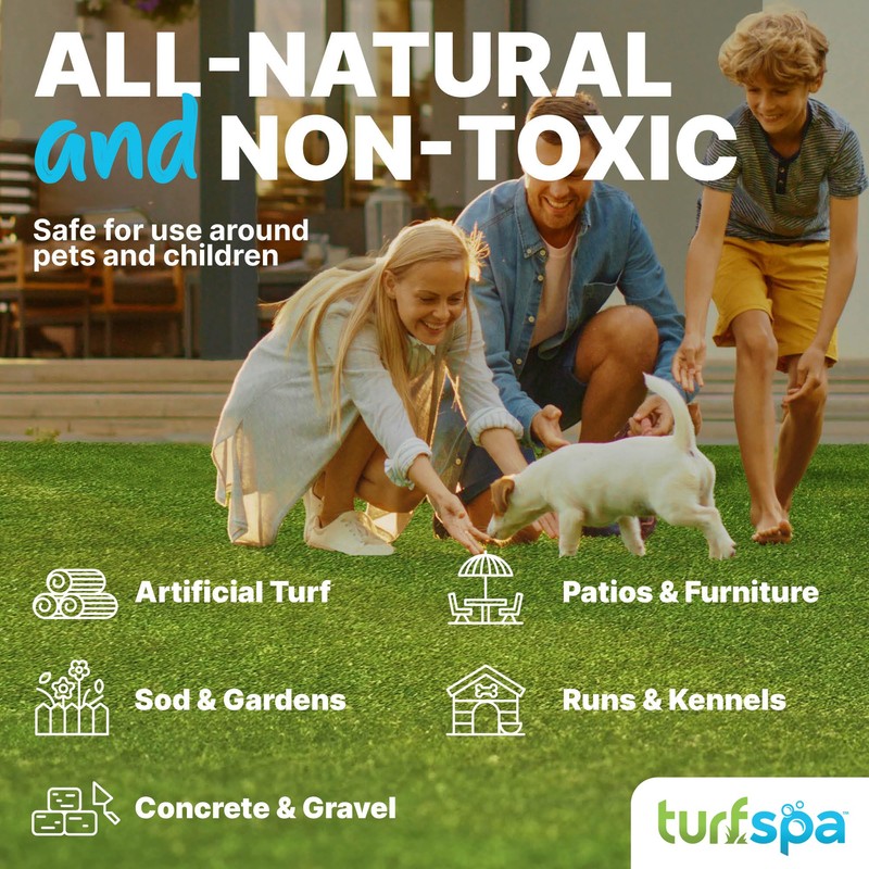 - Safe for Pets and Kids: TurfSpa's urine and odor eliminator is safe for children and pets immediately after application. It is suitable for all surfaces, including artificial grass, concrete, rocks, sod, and patios.