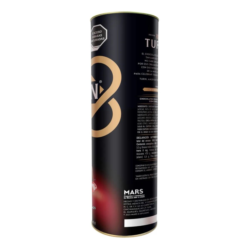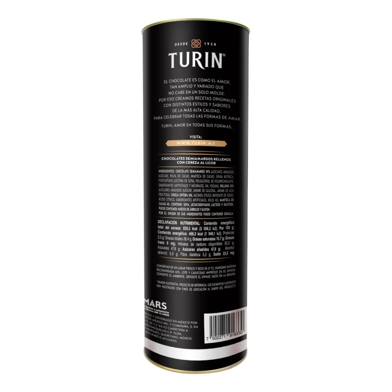 Bombones de chocolate Turín con relleno de cerezas al licor. Presentación en tubo de 180 gramos, que contiene 18 bombones. Si buscas chocolates para regalar, Turín es como el amor, lo encuentras en todas sus formas.
