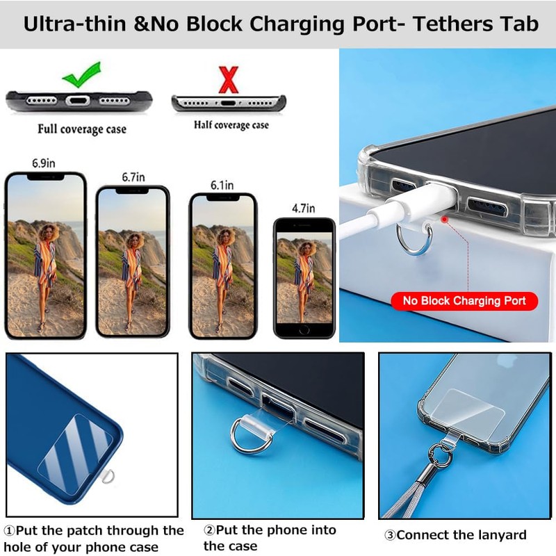 - 【Ultra-thin &No Block Charging Port- Tethers Tab 】:The 0.6MM ultra-thin Tethers Tab with durable “D” metal ring, Compatible for most smartphones with a full coverage case, and keep your phone in safe condition and easy using. No tools required, you just pass the pad through charging hole of fully covered phone case, then insert your phone and connect to the lanyard. the thin pad could support corded and wireless charging without being removed, without blocking the charging port.