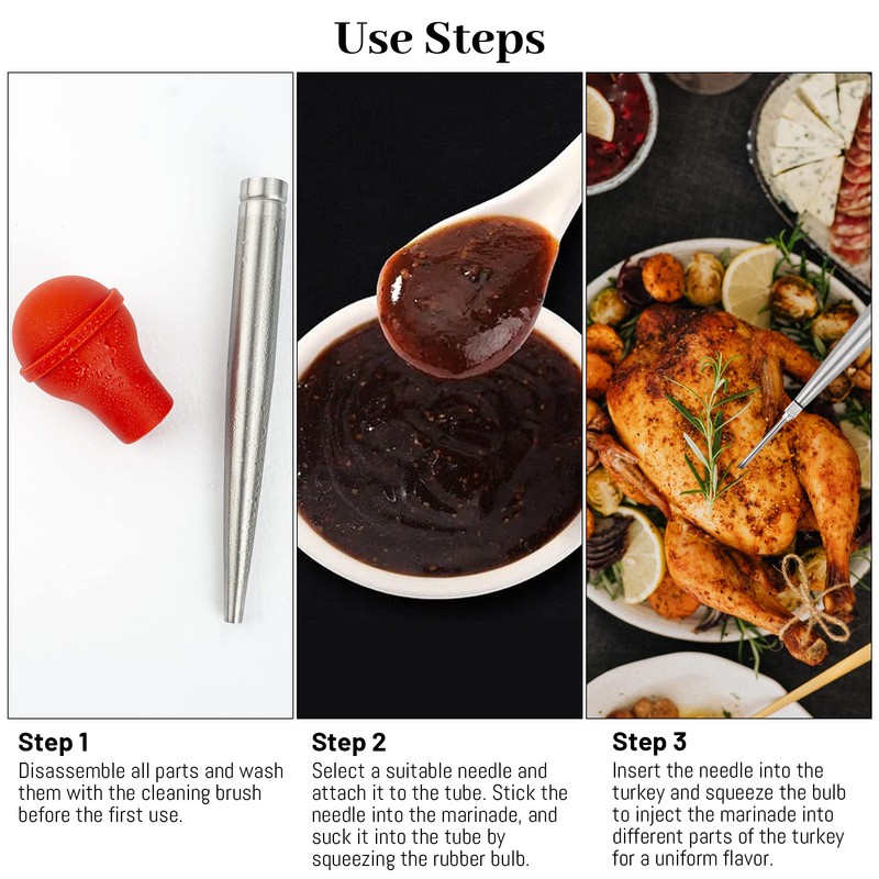 - Turkey Baster Set: The turkey baster set contains 1 bulb, 1 stainless steel tube, 1 cleaning brush, and 2 different turkey injector needles for flavor, it's a good kitchen assistant for your next Thanksgiving or Christmas dinner.