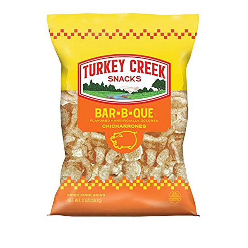 Turkey Creek - America’s Best Fried Pork Skins, offers a 12-Bag Straight Pack of its Bar-B-Q Pork Rinds. These Pork Skin Chips(Chicharrones) are packed with Bar-B-Q 12 - 2.0 oz bags.