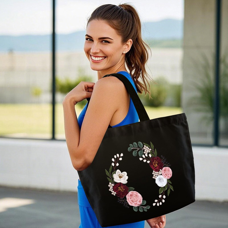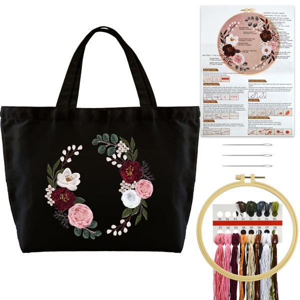 Turmaster Embroidery Set with Canvas Tote Bag, Embroidery Set for Beginners, Embroidery Set Adults with Floral Pattern, Embroidery Hoop, Threads and DIY Embroidery Tools, Black