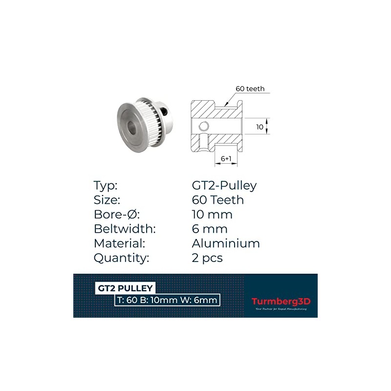 Turmberg3D – 2x GT2 Timing Belt Pulley Drive – 60 Teeth – Bore Diameter: 10 mm – Belt Width: 6 mm (GT2-6 · 60T · Diameter 10)