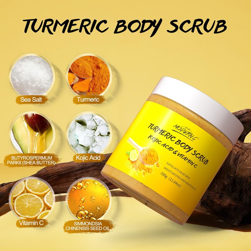 - Active Ingredients: Selected formulas help exfoliate your body while nourishing your skin. Turmeric and Vitamin C as key ingredients to smooth skin. Shea Butter and Jojoba Seed Oil keep skin moisturized so it won't dry out after use.
