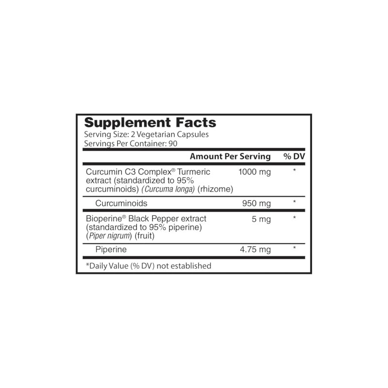 Ingredients: Curcumin C3 Complex Turmeric (standardized to 95% curcuminoids) (Curcuma longa), (rhizome) 1,000 mg*, BioPerine Black Pepper Extract (standardized to 95% piperine) (Piper nigrum) 5 mg*