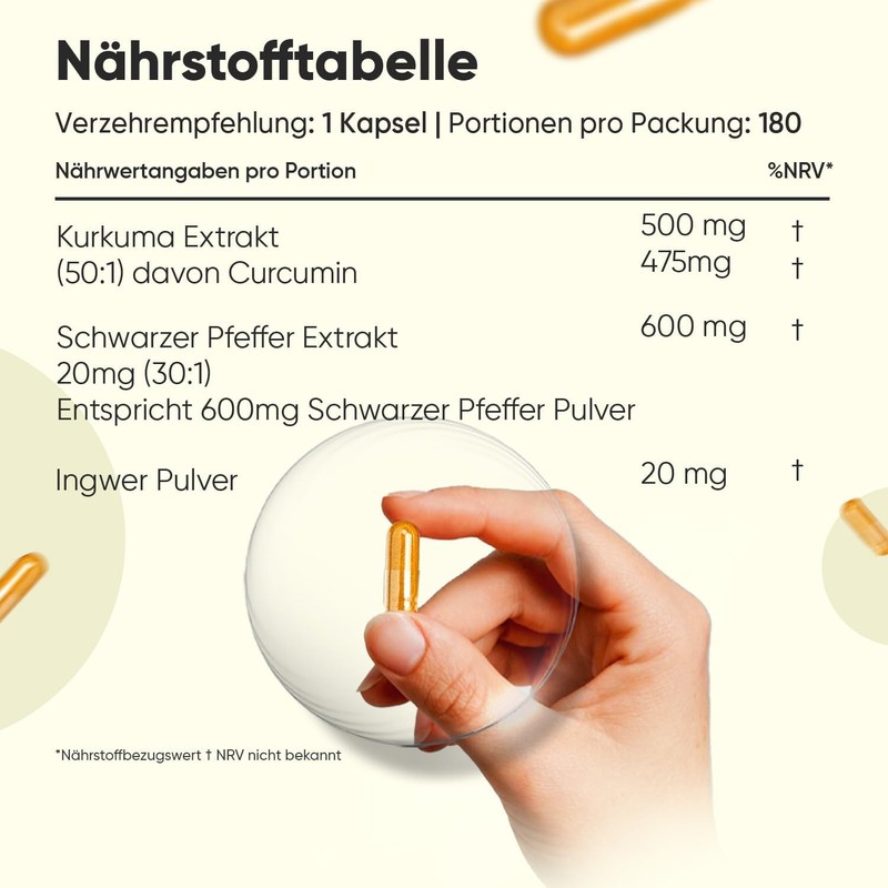 Turmeric Extract Capsules - 500 mg Curcuma Extract - 180 Pieces for 6 Months - Curcumin with 20 mg Ginger & 600 mg Black Pepper - 1 Capsule Daily - Curcumin - WeightWorld