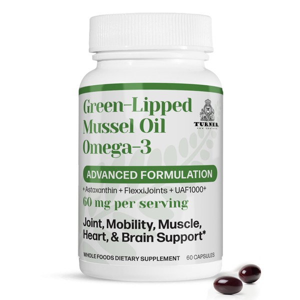 TURNER Omega-3 New Zealand Green Lipped Mussel Oil, 53x Higher Potency with UAF1000+ Super Antioxidant for Superior Joint Comfort & Mobility, No Fishy Aftertaste, 1 Bottle, 60 Softgels