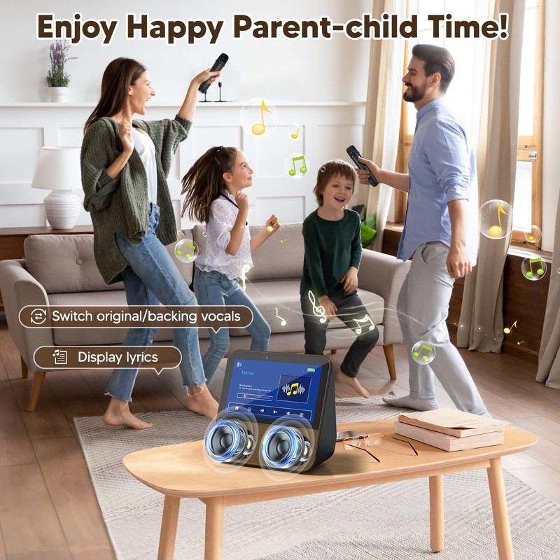 - 【Karaoke Machine with 2 Wireless Microphones】Pair to your phone or tablet via Bluetooth and sing along to your favorite music, you can also see the lyrics on the screen ; Works with all your favorite karaoke apps; No CDs to purchase. Our microphone supports five types of sound switching, you can manually adjust effect to your audio to create a specific ambience and sense of space!