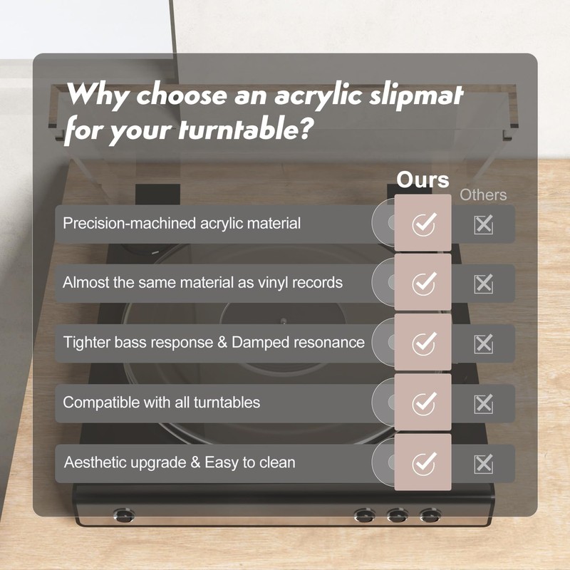 - Turntable Slipmats Upgrade Sound Quality: This clear record mat is precision-machined from acrylic. Since acrylic has similar properties to vinyl records, this 12 inch slipmat is an essential upgrade for vinyl collectors to enhance sound quality