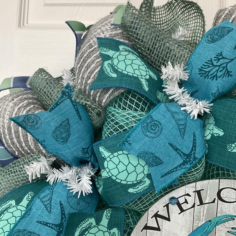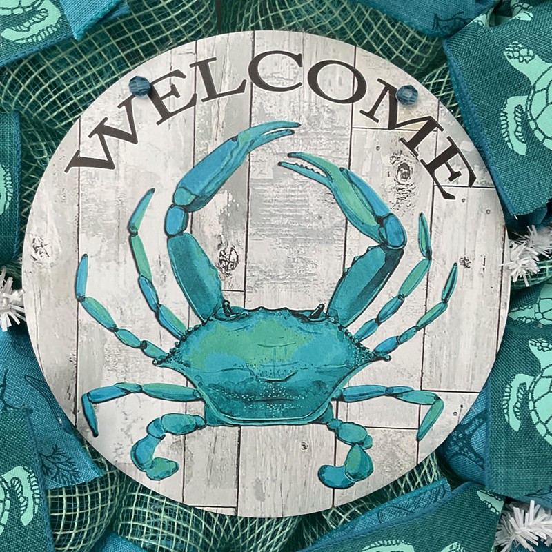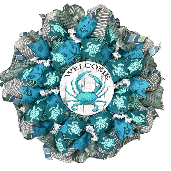 Turquoise Welcome Crab Handmade Deco Mesh Beach Wreath Available in 24 inch and 28 inch diameters