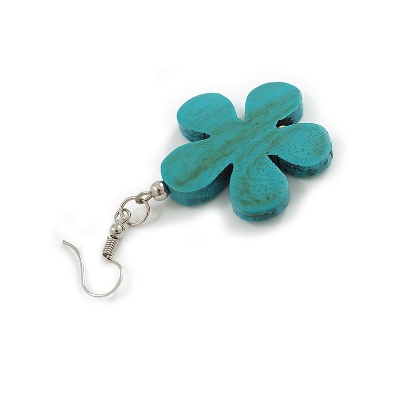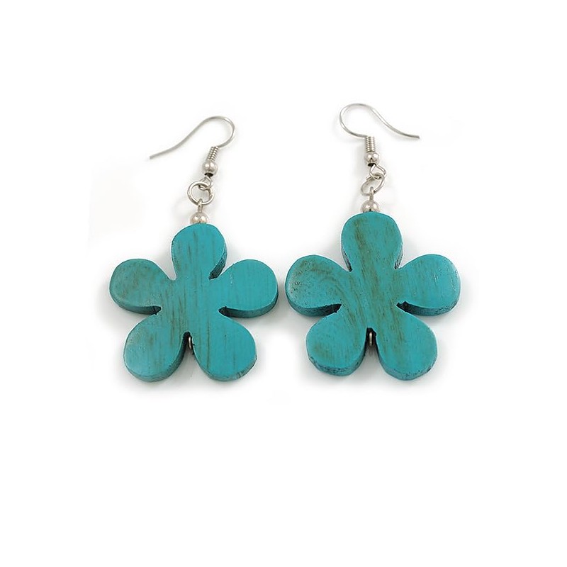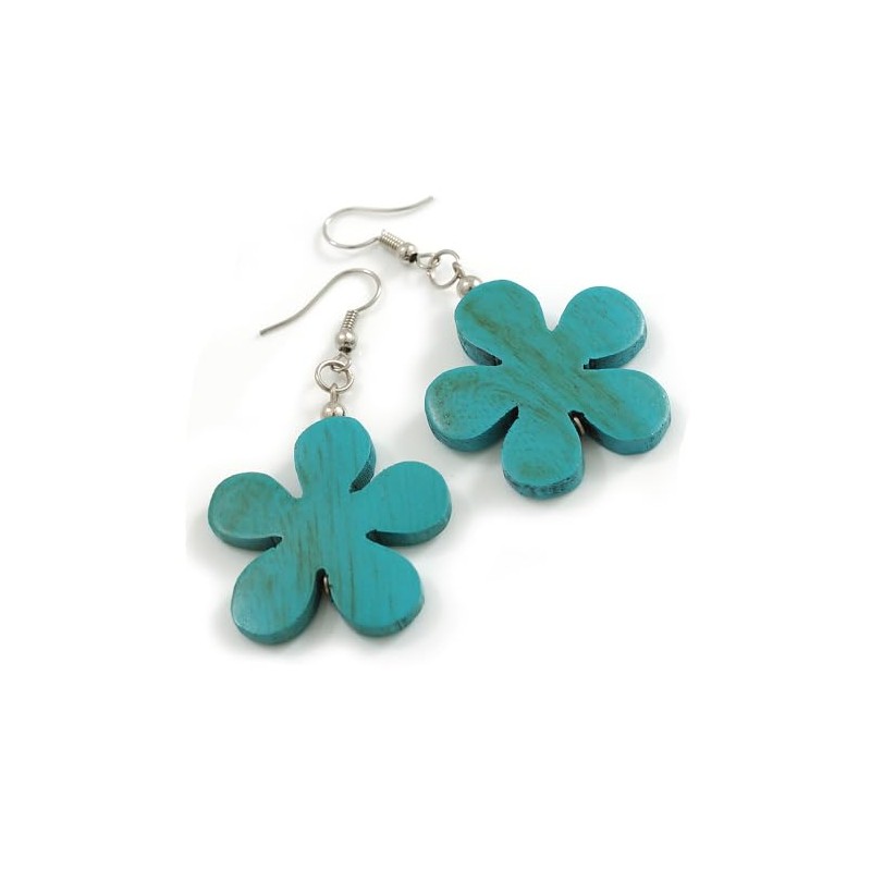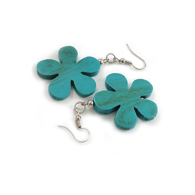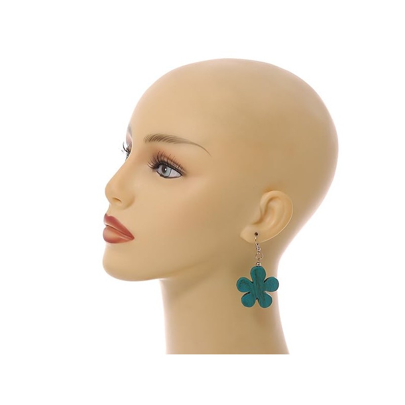 Turquoise Wood Flower Drop Earrings/60mm Long