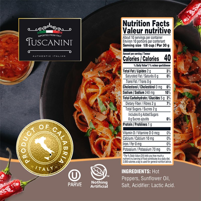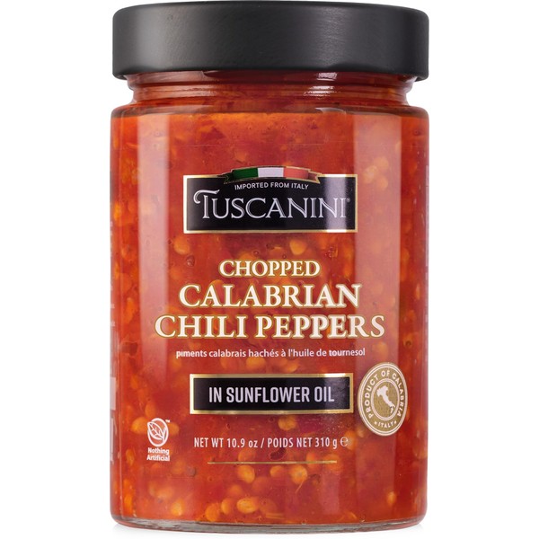 Tuscanini Premium Italian Chopped Calabrian Chili Peppers In Sunflower Oil, 10.9 oz | All Natural | Nothing Artificial | Crushed Chili from Italy | Kosher