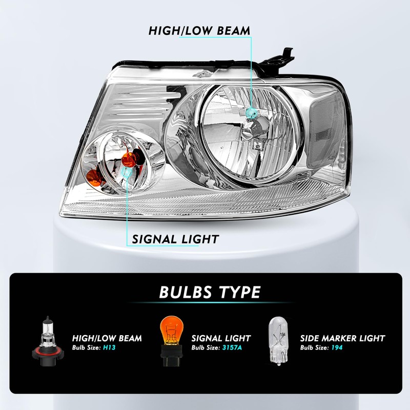 - 【SUITABLE MODELS】Headlights Assembly Compatible with 2004-2008 Ford F-150 Pickup, 2006-2008 Lincoln Mark LT Models Driver and Passenger Side. Not compatible with 2004 F-150 Heritage Model. Not compatible with Flareside Beds Model. High / Low beam bulb type: H13 (Included); Signal light: 3157A (Included); Side marker light: 194 (Included).