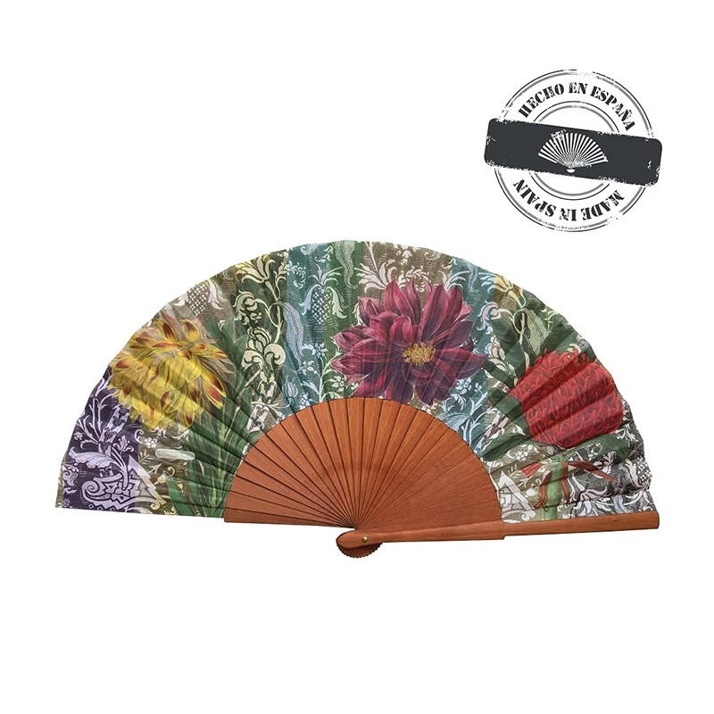 - Wooden and cotton fans: Tusitala Barcelona fans are made from sanded fruit wood sticks and high-quality cotton fabric. Dimensions: 23 cm. The floral fan creates a patchwork of botanical inspiration and flowers mixed with fabrics. Pair it with green, red, white for a day look. This fan is part of the Patchwork Fan Collection.