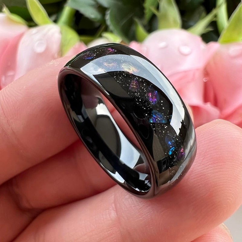 - 8mm Black Tungsten Carbide Rings for Men Women Outer Space Nebula Galaxy Blue Gemstone Purple Amethyst Inlay Promise Engagement Wedding Band Polished Shiny Comfort Fit