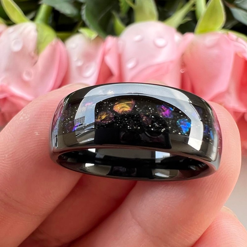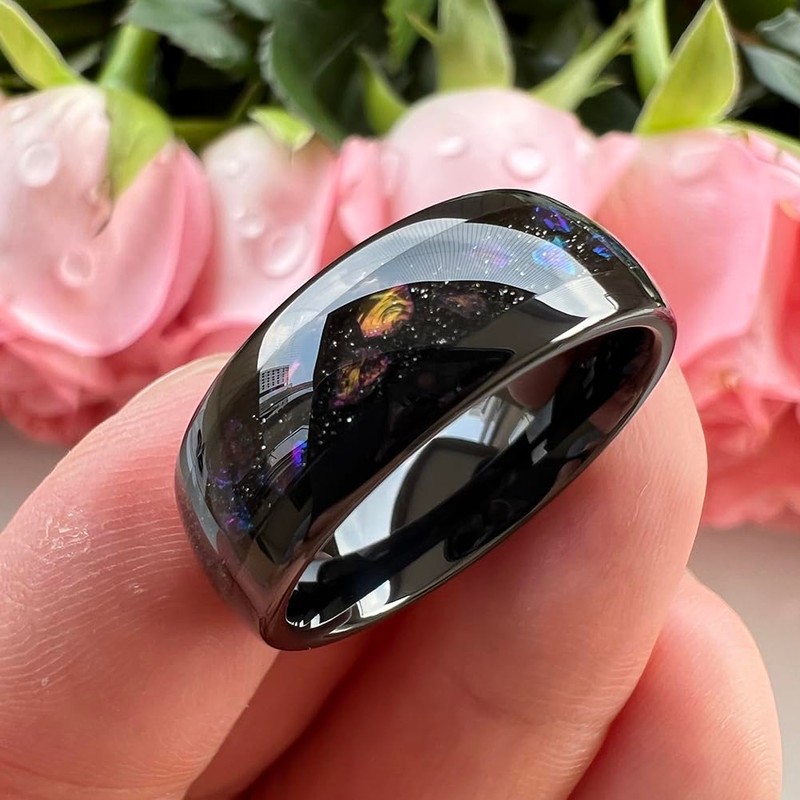 TUTISS 8mm Black Tungsten Rings for Men Women Outer Space Nebula Galaxy Gemstone Purple Amethyst Inlay Engagement Wedding Band Polished Comfort Fit, Metal, No Gemstone