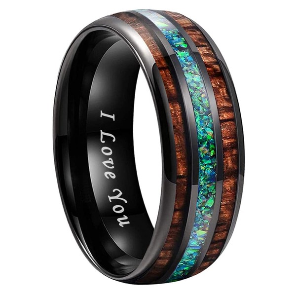 - 8mm Silver, Black, Gunmetal & Rose Gold 4 Colors Available Tungsten Carbide Rings for Men Women Anniversary Promise Engagement Wedding Bands Koa Wood Green Opal Inlay Domed Polished I Love You Engraved Comfort Fit