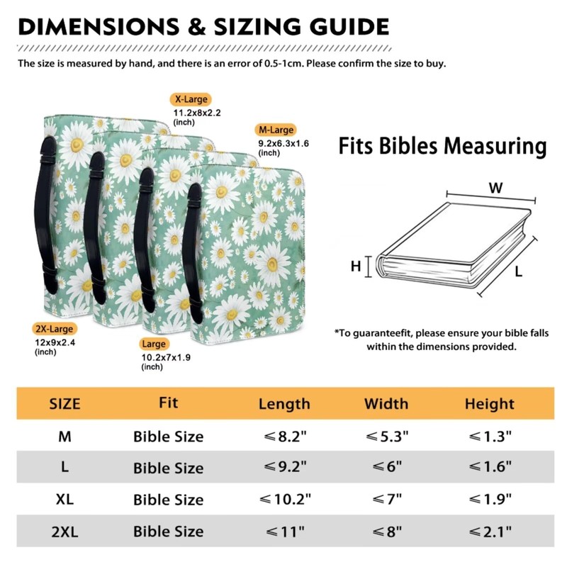 - Size : Here are 4 sizes available. The M size comes in : 8.2”*5.3”*1.3”; The L size comes in : 9.2”*6”*1.6”; The XL size comes in : 10.2”*7”*1.7”; The 2XL size comes in : 12”*9”*2.4” Please check the size of your Bible or book refer to the size chart carefully before purchasing. The wristlet lanyard measures 5 x 0.9 inch