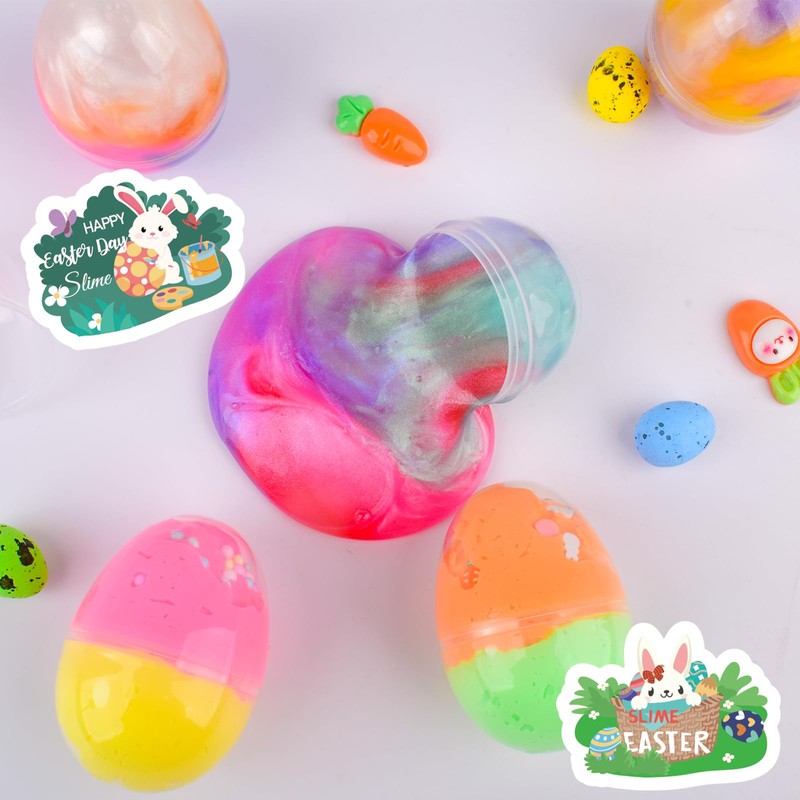- Pre-Filled Easter Fun - This set includes 5 pre-filled Easter eggs, each with a jar of premade slime There are 2 butter slimes and 3 starry sky fantasy galaxy slimes, 2 stickers, 5 charms, and 2 packs of fillers for added fun.