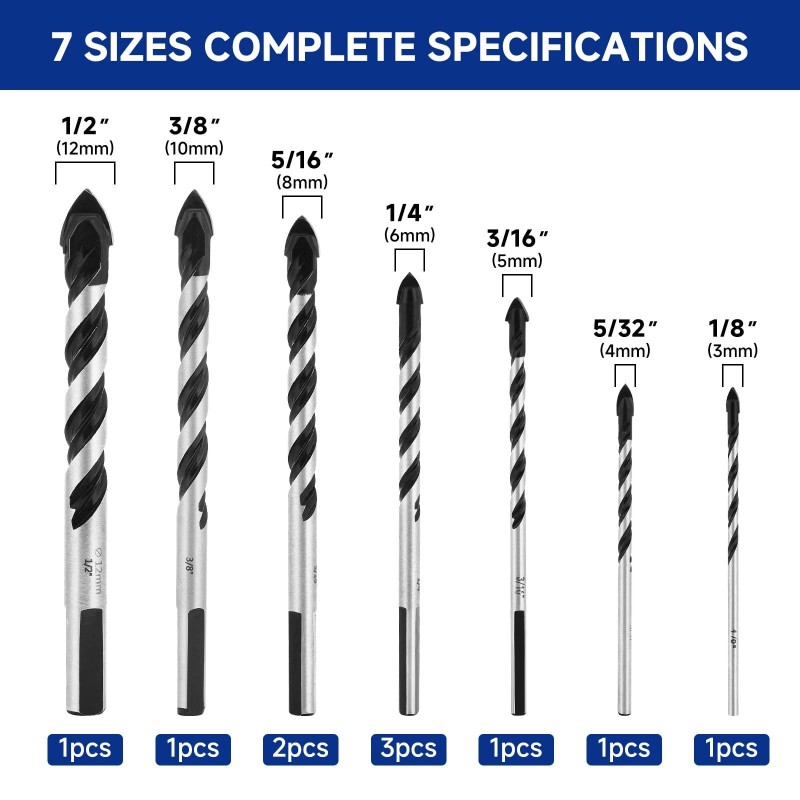 2.Meet your multiple use requirements:Package includes 10 pieces of drill bits set: 1/8'', 5/32'', 3/16'', 1/4''*3, 5/16''*2, 3/8'', 1/2 '' total 7 different sizes multifunctional drill bits, you can start from the smallest drill bit and drill according to the required size.