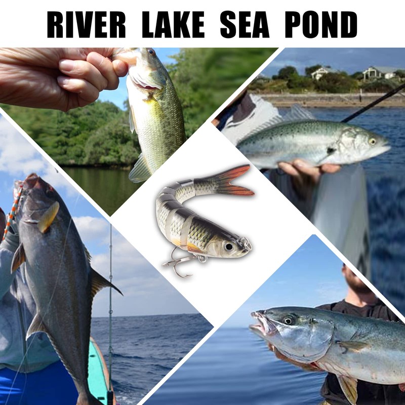 - Material: durable and solid ABS plastic with 2 sharp carbon steel hooks, odor free and environmentally friendly. The bait consists of 8 different joints