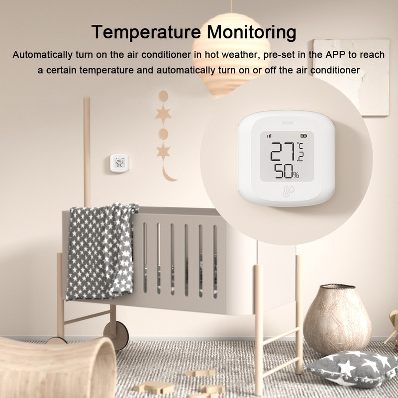 This Tuya temperature and humidity tester adopts premium quality sensors to ensure high accuracy of measurement data, with high sensitivity, ultra-low power consumption, one-button refresh, fast response. It can be used as a temperature and humidity data source, and a lot of automation can be done according to the data source. Support custom scene setting, you can preset the alarm value of temperature and humidity in APP, when the test value reaches the alarm value, APP will push the alarm. It can help accurately monitor indoor temperature and humidity, create a comfortable living environment no matter the weather is hot in summer or cold in winter.