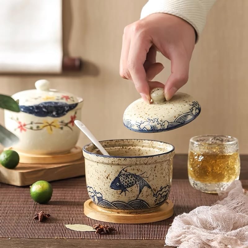 - The ceramic spice jar with lid and spoon can be used to hold a variety of spices, such as sugar, salt, pepper, spices, jams, tea, coffee, honey and olive oil, etc.