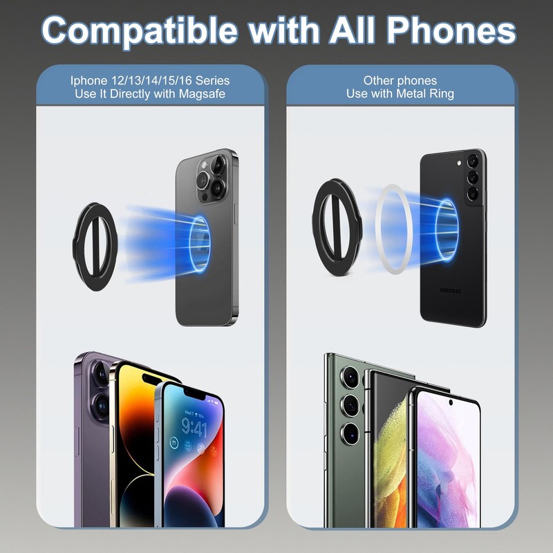 - Compatible with All Phones:Our phone holder for cars is universally compatible, working with all phone models, compatible with iPhone 16, 15, 14, 13 series. The metal ring included in the package can be attached to Android phones, and cases