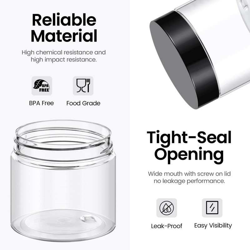 • Premium Quality: These sample jars are made of thick PET material, BPA free, food grade, sturdy, refillable, high impact resistance, and wide mouth design that can be easily filled and removed