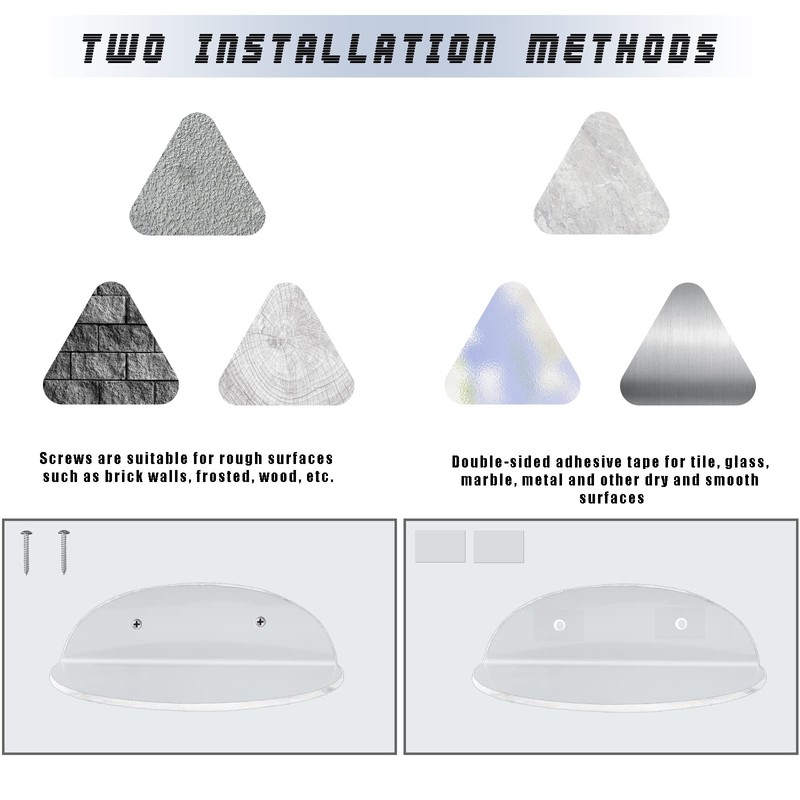- 📚️【Zwei Installationsmethoden】Schrauben oder doppelseitiges Klebeband, zwei Installationsmethoden, doppelseitiges Klebeband eignet sich für trockene und glatte Oberflächen wie Fliesen, Glas, Marmor, Metall usw.. Verwenden Sie es nach 24 Stunden Kleben, die maximale Tragfähigkeit kann 3 kg erreichen, oder verwenden Sie Schrauben zum Befestigen den Wandregal, um stärker zu gewährleisten.