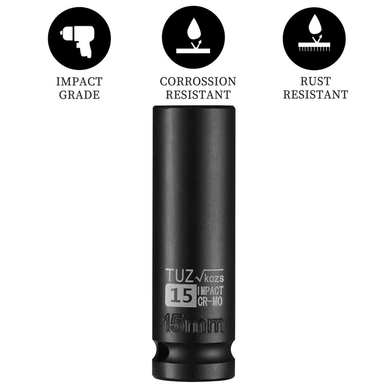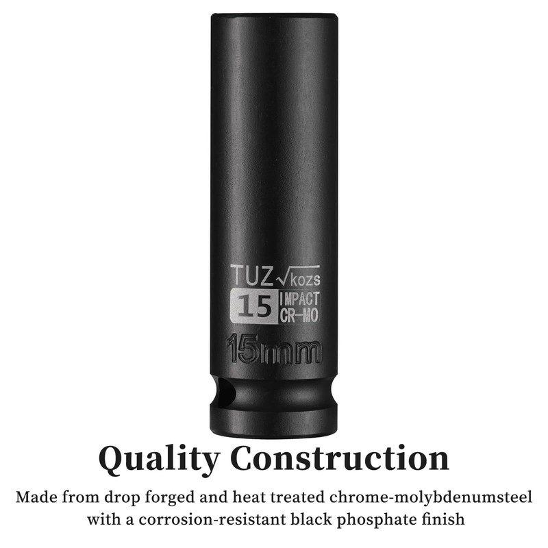 TUZkozs 1/2-Inch Drive 15mm Deep Impact Socket with 6-Point Design, Heat-Treated Chrome Molybdenum Alloy Steel, Metric,Hex Deep Socket