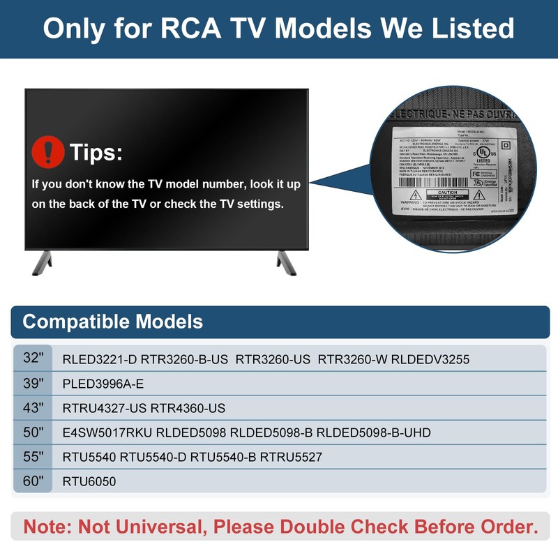 • ★Compatible Models--- Replacement legs for RCA TV stand. For RCA TV legs replacement RLED3221-D RTR3260-B-US RTR3260-US RTR3260-W RLDEDV3255 PLED3996A-E RTRU4327-US RTR4360-US E4SW5017RKU RLDED5098 RLDED5098-B RLDED5098-B-UHD RTU5540 RTU5540-D RTU5540-B RTRU5527 RTU6050. ⚠ Important Notes -- Only for the RCA TV models we listed!