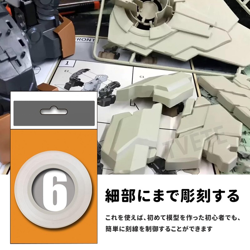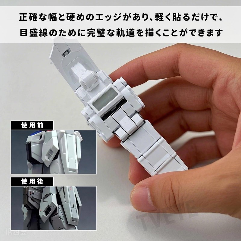 • Product Contents: Hard edge tape for carving guide lines for plastic models. The total length of the tape is about 66.6 ft (2The moderate thickness of 0.1mm allows for a secure fit on curved surfaces without distortion
