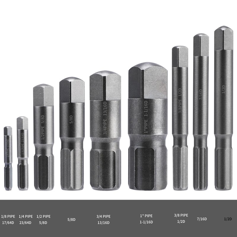 - 【Wide Size Range (9-Piece Kit)】Fits standard NPT pipe sizes from 1/8" to 1" (including 1/8", 1/4", 3/8", 1/2", 3/4", and 1").Includes 3 extended drill bits (5/8", 1/2"D, 7/16"D) for hard-to-reach pipes in tight spaces. Laser-etched size markings on each extractor + required drill bit size for faster, error-free operation