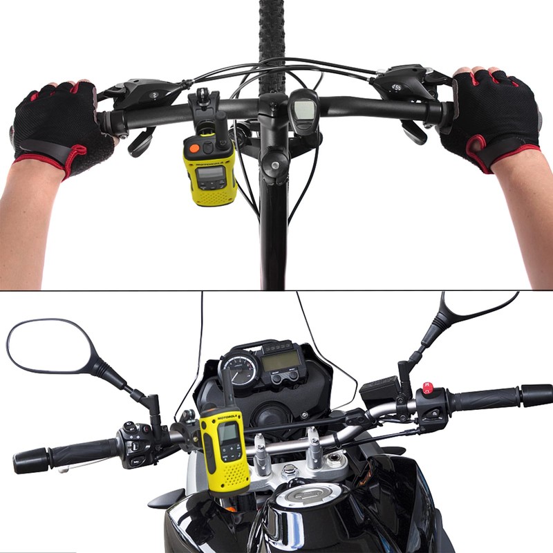 - This handlebar clamp mount is a good choice for people who want to bring their handheld radios to use in the bike. It is designed for handheld walkie-talkies with belt clip.