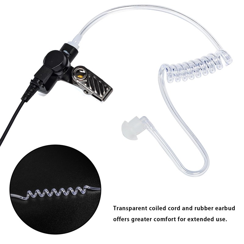 - [Clear Acoustic Coil Tube] This comfortable surveillance earpiece with transparent coiled cord and rubber earbud offers greater comfort for extended use. The in-ear design allows the radio's sound to be transmitted clearly into the ear without interference from the surrounding environment. The package also includes a replacement earbud.