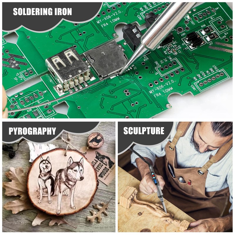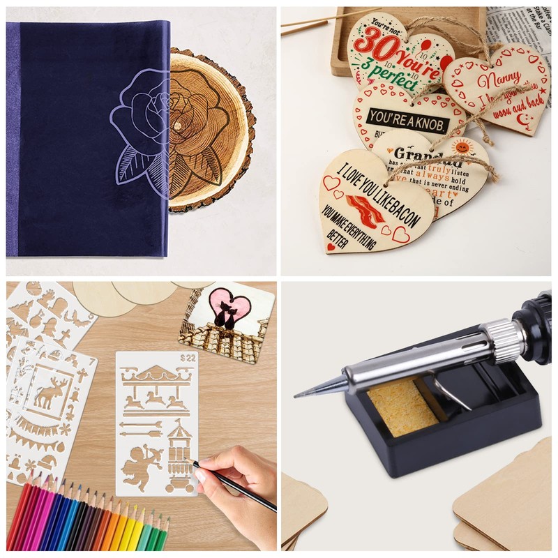 - 80 W soldering iron set: this pyrography wood contains 108 accessories: 1 lightweight pyrography pen with a comfortable grip, 41 x welding tip, 4 converters, 2 blades, 14 pyrography stencils, 18 coloured pencils, 1 soldering iron stand, 1 sharpener, 1 pair of gloves. 2 2 cars 2 9 hot press boards in different shapes, 1 cleaning brush, 1 soldering wire, 1 Oxford carrying case, 1 instruction manual (English language not guaranteed).