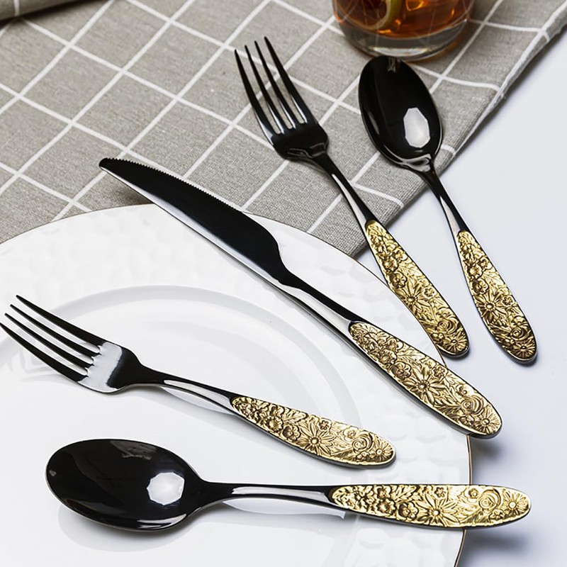 TWEE Black Gold Silverware Set for 4 Unique 18/10 Stainless Steel 20 Flatware Set Beautifully Embossed Floral Pattern Mirror Polished Kitchen Utensils Set for Home Restaurant Tableware