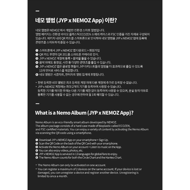 - Components : 1ea QR Card, 1ea Special Photo Card, 1ea Photo Card(1set 9ea), 1ea Manual Card, 1ea Lyric Paper