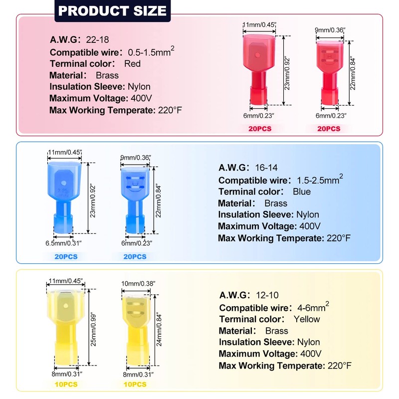- Nylon Quick Spade Connectors Comes With Three Different Sizes:Red-AWG 22-18, 20 PCS male and 20 PCS female;Blue-AWG 16-14, 20 PCS male and 20 PCS female; Yellow -AWG 12-10, 10 PCS male and 10 PCS female