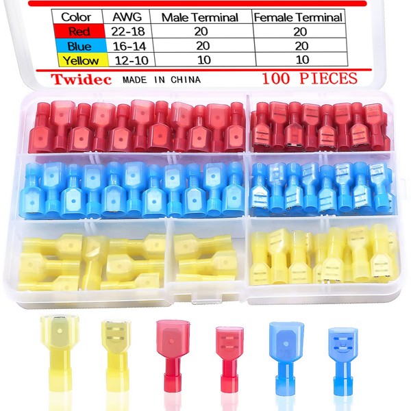 Twidec/100PCS Nylon Spade Connectors Kit 22-10 Gauge Quick Disconnect Fully Insulated Male and Female Wire Spade Terminal Assortment Kit N-004