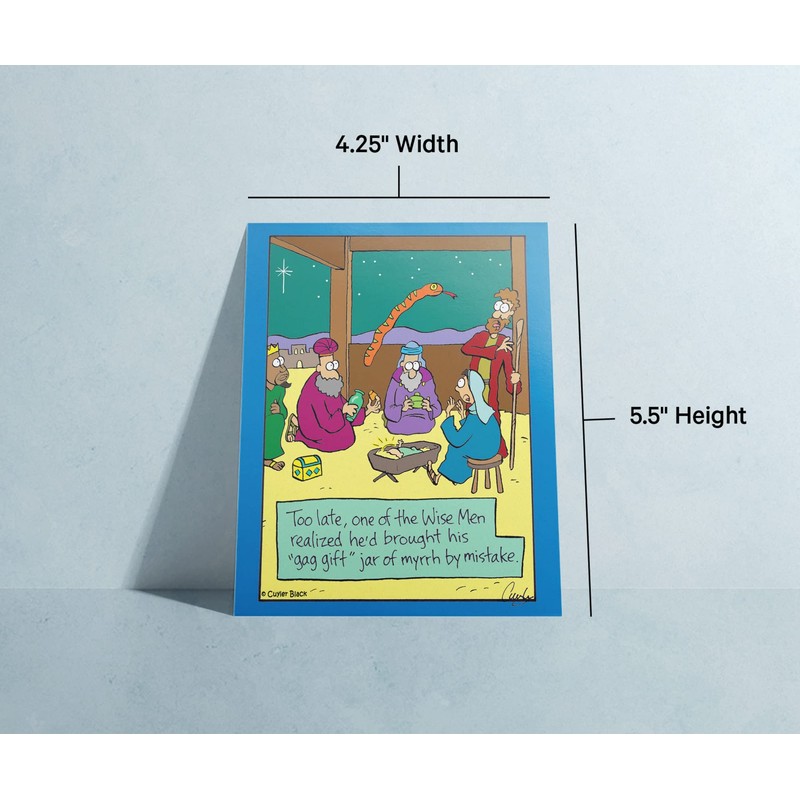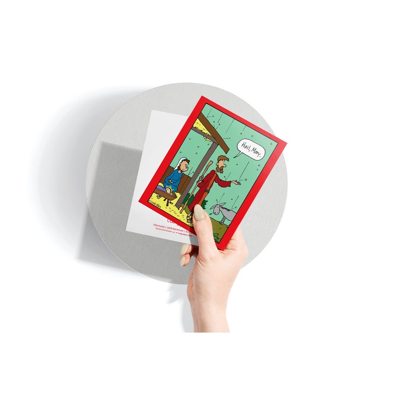 • Designs include hilarious Three Wise Men, Our Son is God, Hail Mary, and Nativity themes. Cards are A2 size and measure 5.5" x 4.25" when folded. They are packaged flat and scored for easy folding.