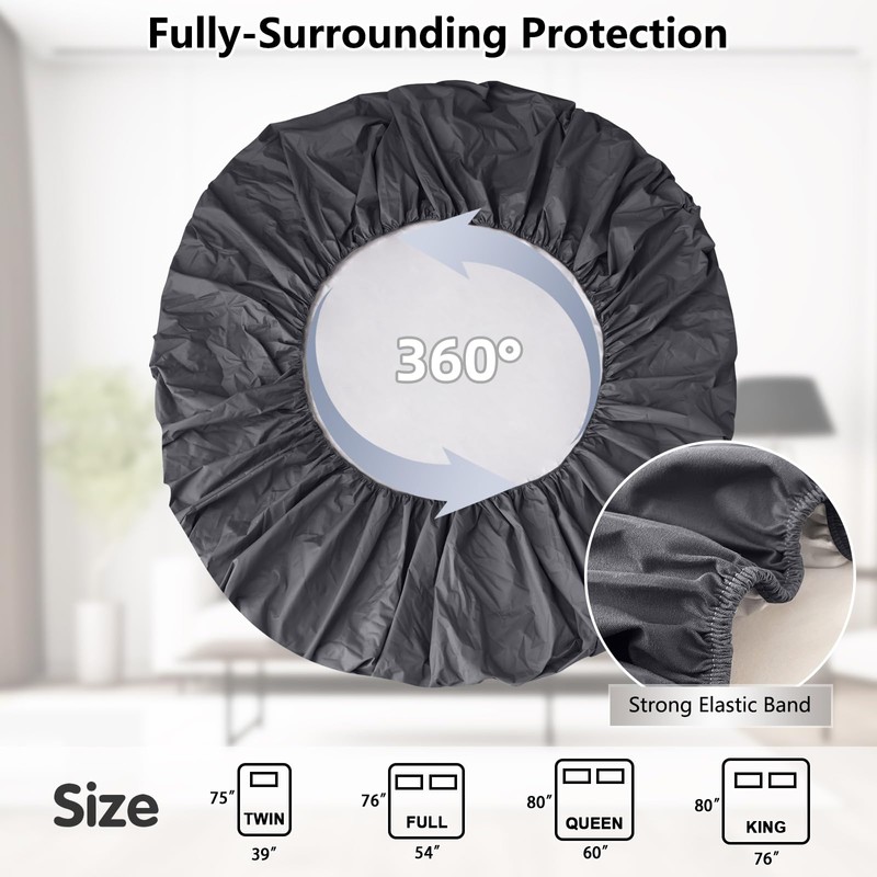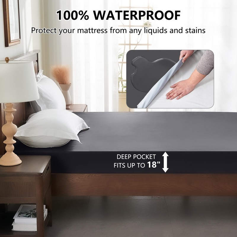 - 360° Elastic Band & 18'' Deep Pocket: The waterproof Bed Cover features a sturdy elastic skirt and 360° full surround design, ensure fitted bed sheet perfect fit each corner of mattress, provides full protection for the top and sides of the mattress. No matter how you move on the bed,this mattress cover will stay in place all the night. Deep pocket design makes it easy to install and accommodate mattress of various thicknesses, ,fits any mattress depth up to 18''