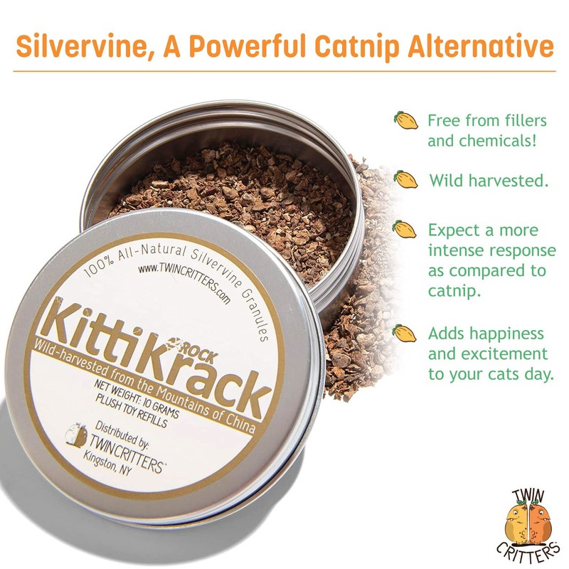 - Caring for your Cat: The continued good health of your fur-baby is our top priority here at TWINCRITTERS. This is why we’ve made our KittiKrack Rock Cat Toy Refill Granules from pure wild growing silvervine fruit without any additives or preservatives.