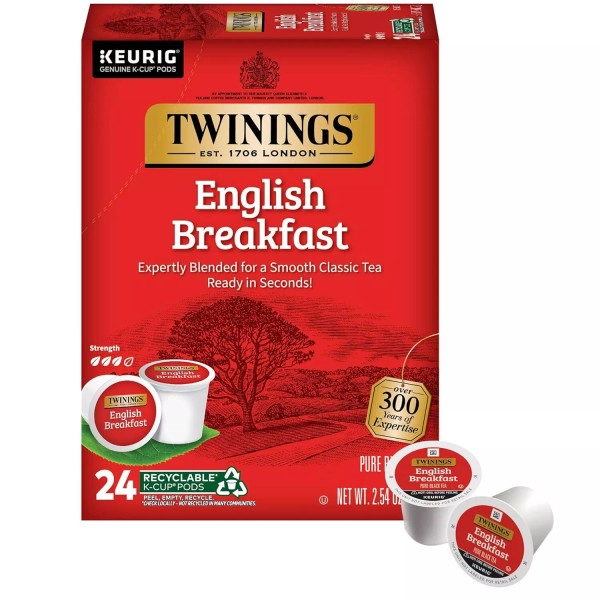 - ENGLISH BREAKFAST TEA K-CUP PODS: Twinings English Breakfast Tea Pods; Our most popular black tea for a refreshing recharge any time of day; Caffeinated