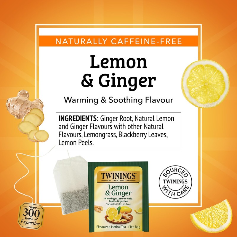 All natural and caffeine-free herbal tea with an invigorating blend of zesty lemon and ginger. The zesty citrus flavour of lemon has been invigorating the tea experience for hundreds of years. Chinese herbalists were known to use the pungent taste of ginger in tea over 2500 years ago. Today the expert blenders at Twinings have combined these two great flavours for lively and enjoyable herbal tea experience.