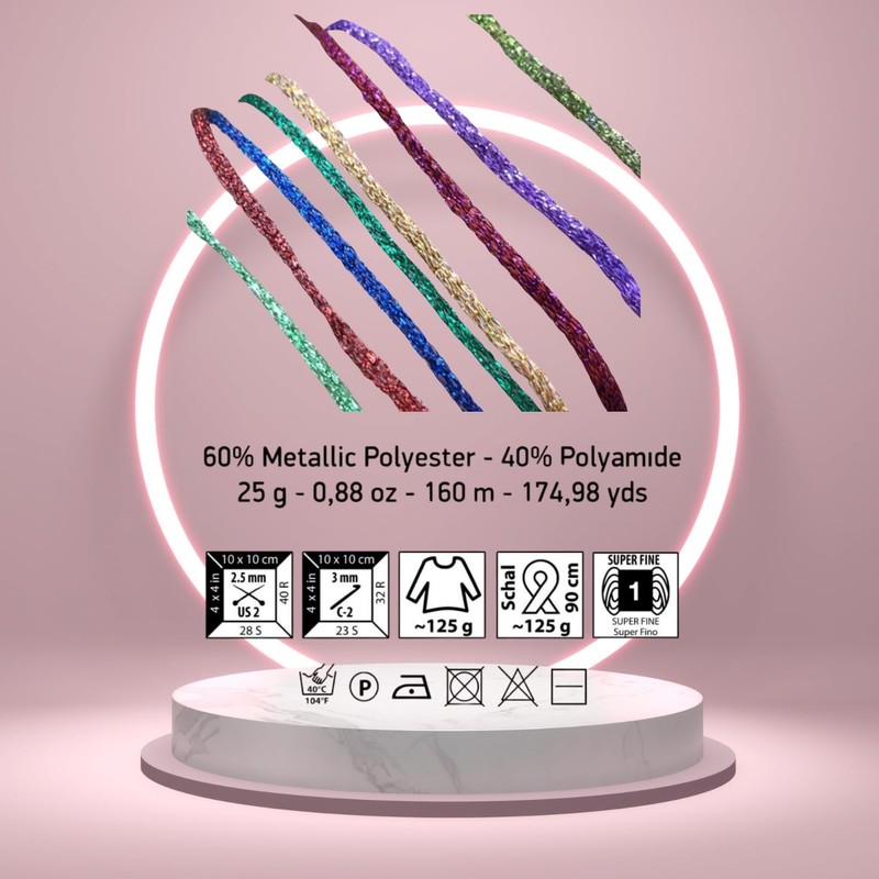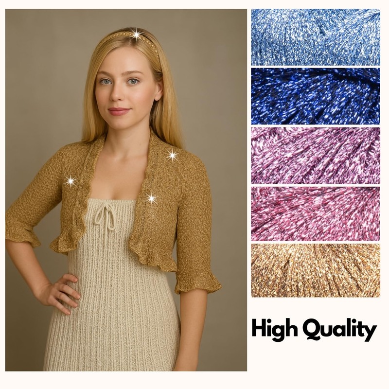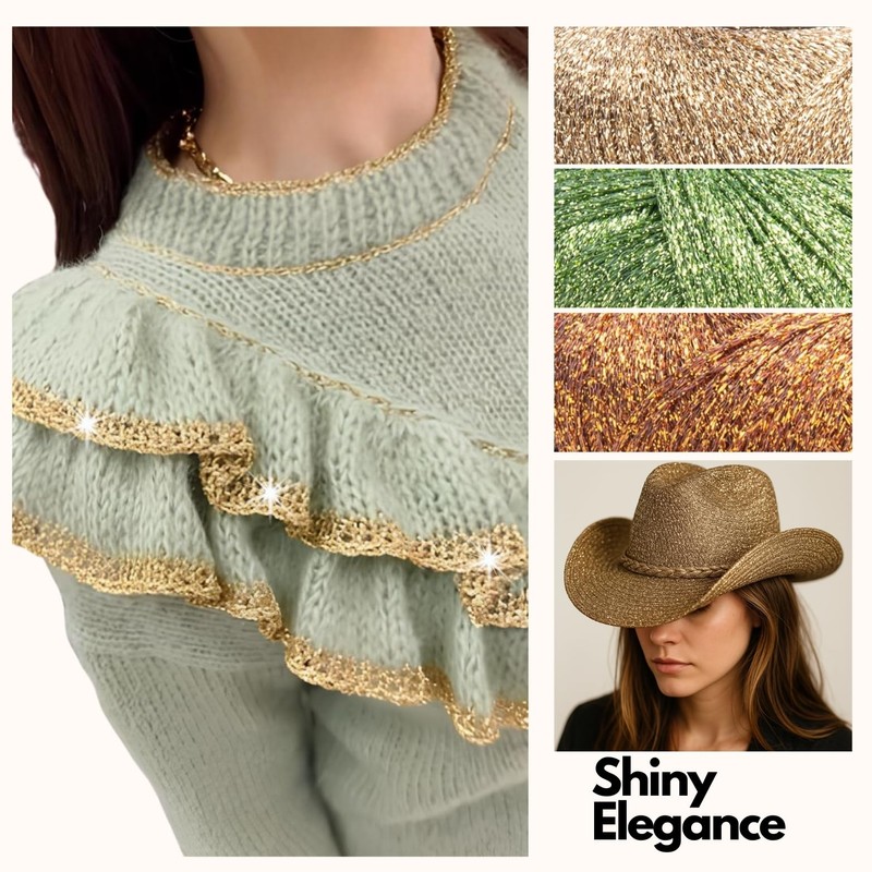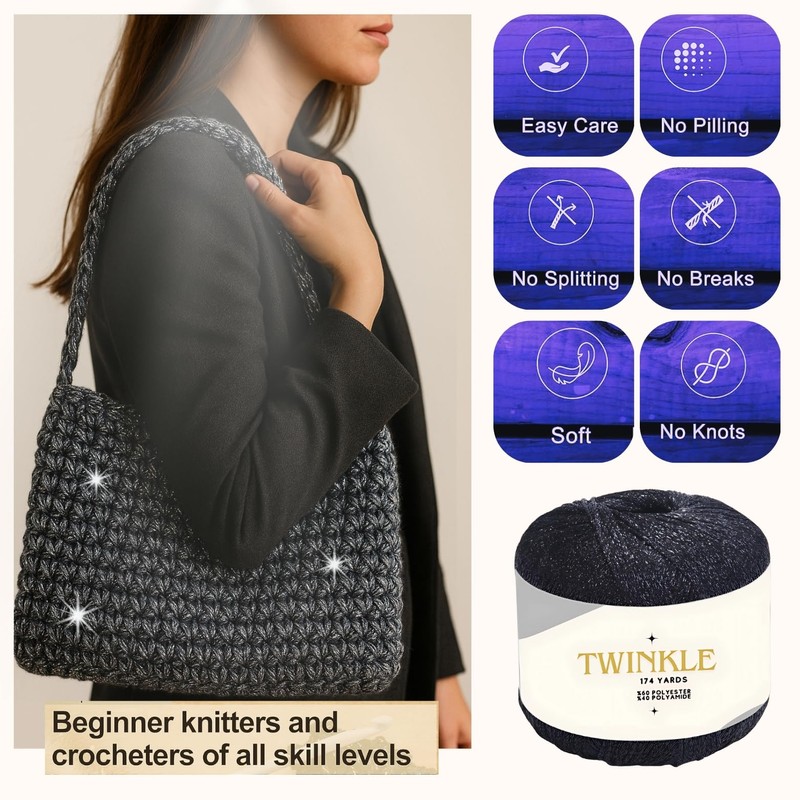 - Metallic Glitter Yarn with Sparkle & Twinkle Effect This fine, shiny, lurex tinsel yarn adds a glittery and sparkly touch to your projects. The metallic fiber creates a twinkle effect, perfect for crocheting, knitting, and crafting unique designs with sequins & thick threads.