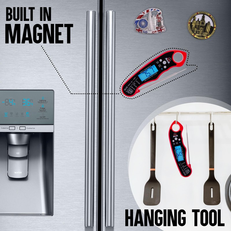 - Additional Features: When you're done cooking or grilling for the day, hang the kitchen thermometer with the included hanging hole. Our kitchen thermometer for cooking also comes equipped with an internal magnet on the back side of it for additional utility and storage.
