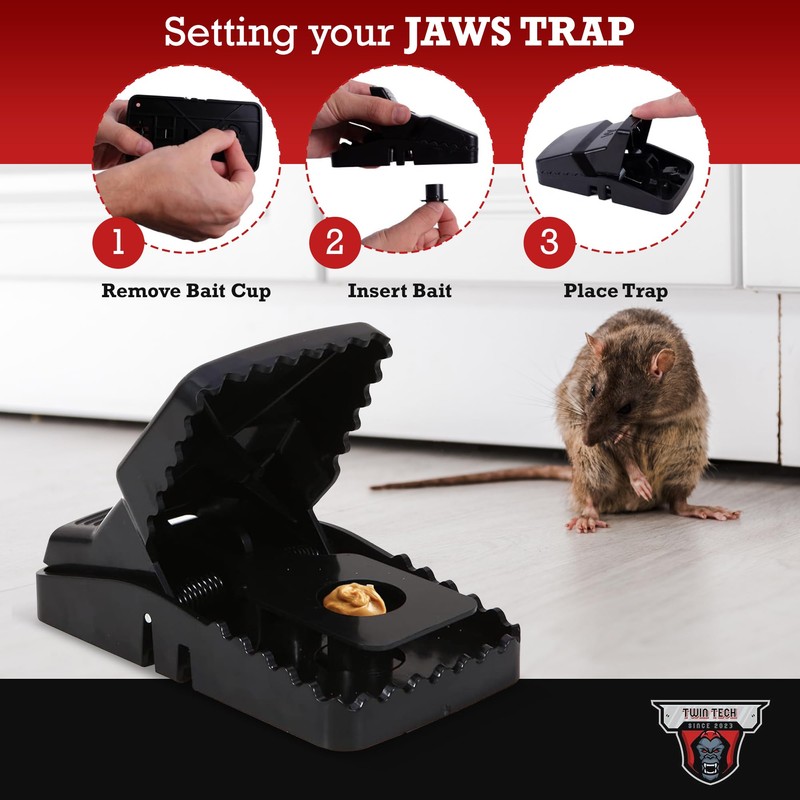 • Powerful Trap Mechanism: The TwinTech traps are engineered to tackle both small mice and large rats with ease. Featuring a robust, spring-loaded design, these traps are built from high-quality, durable plastic to ensure long-lasting rodent control.